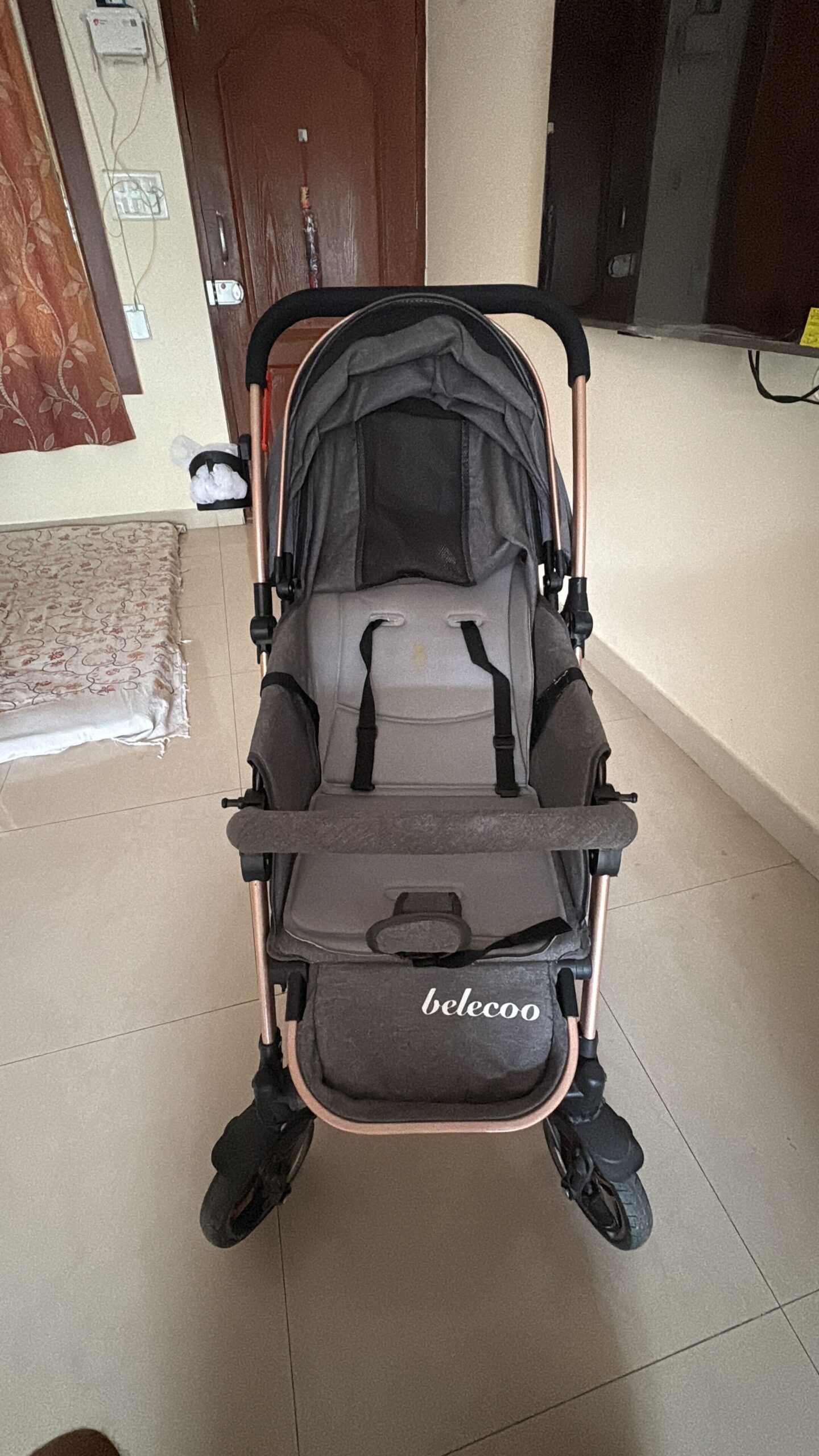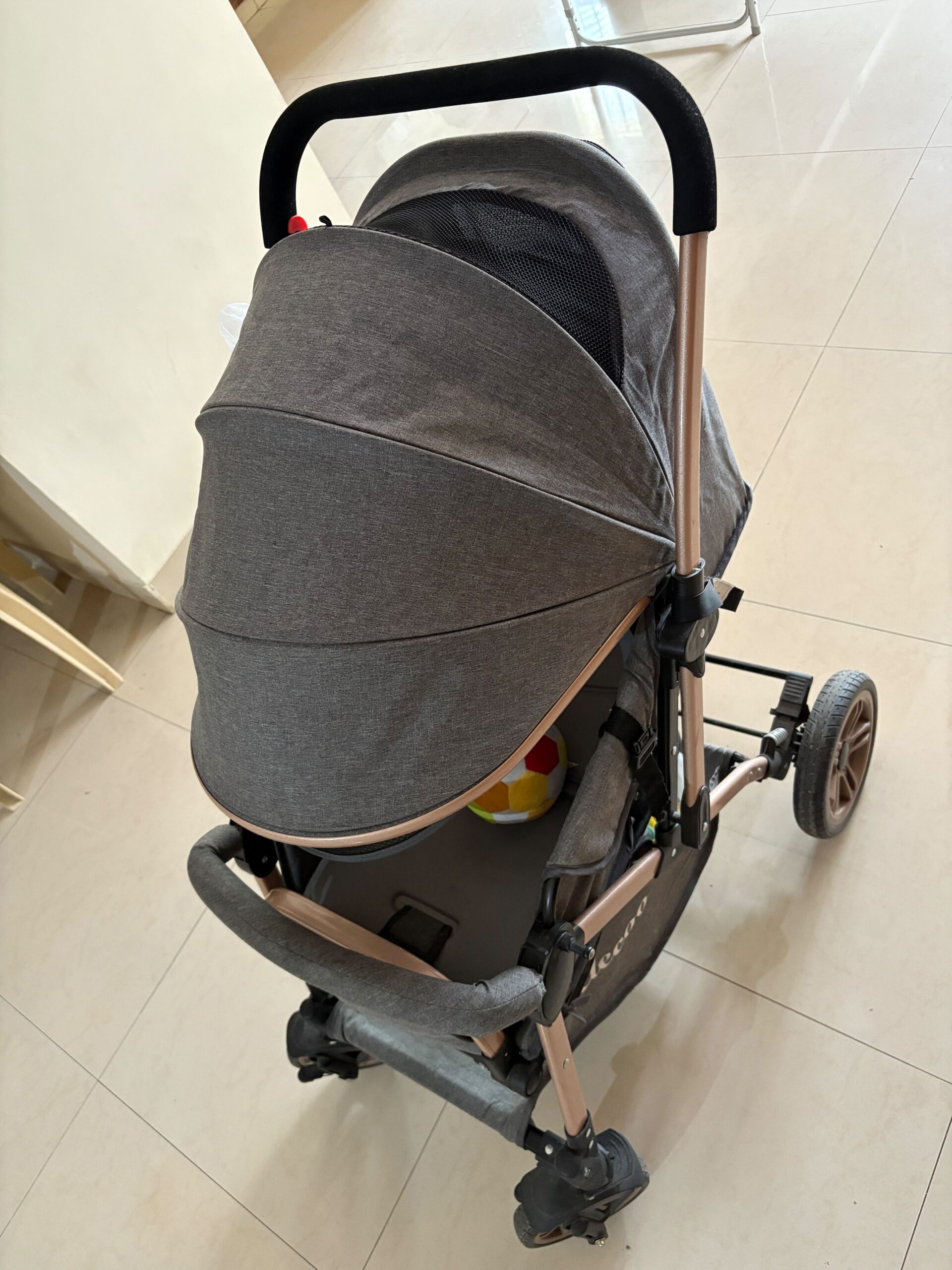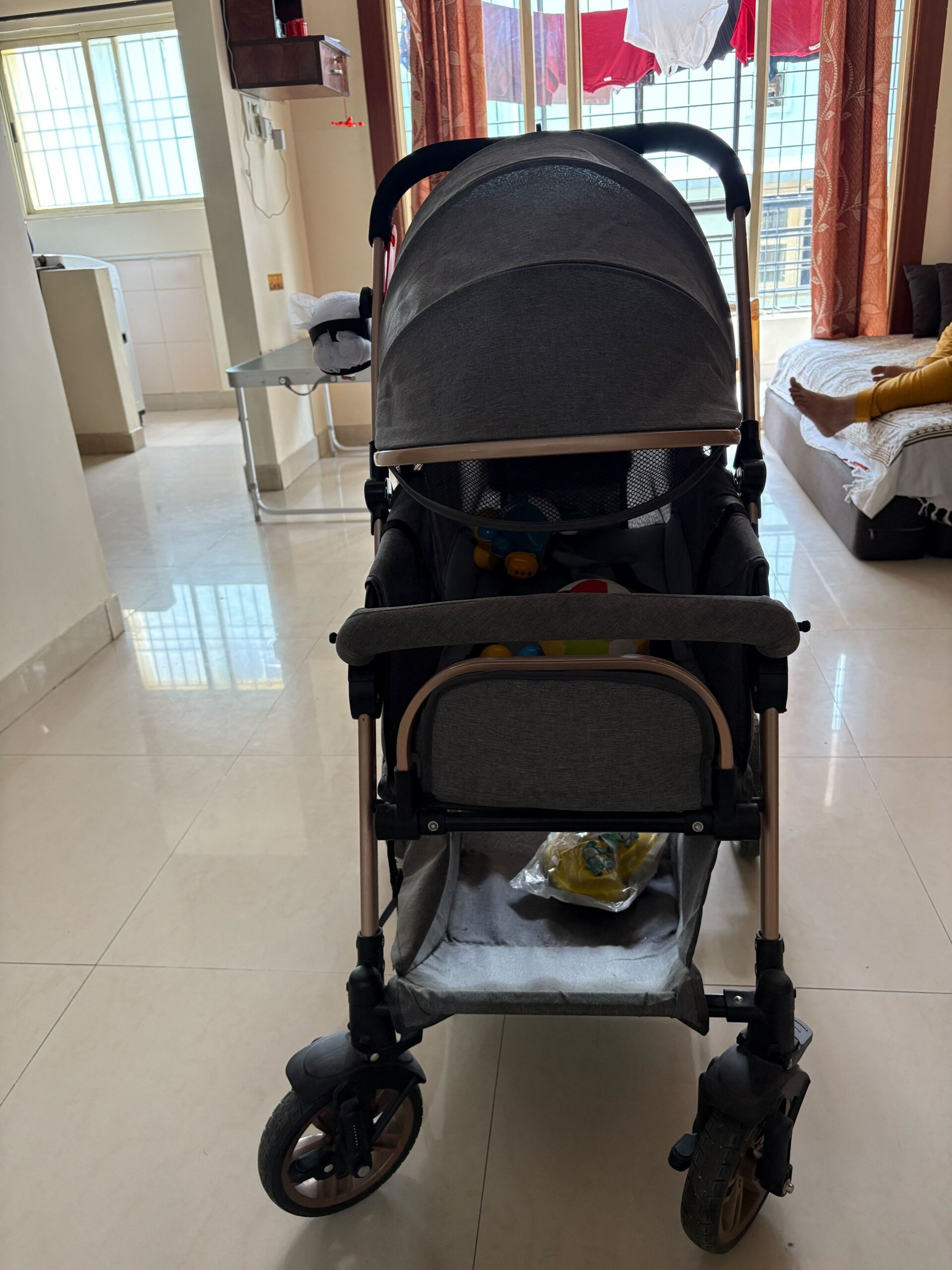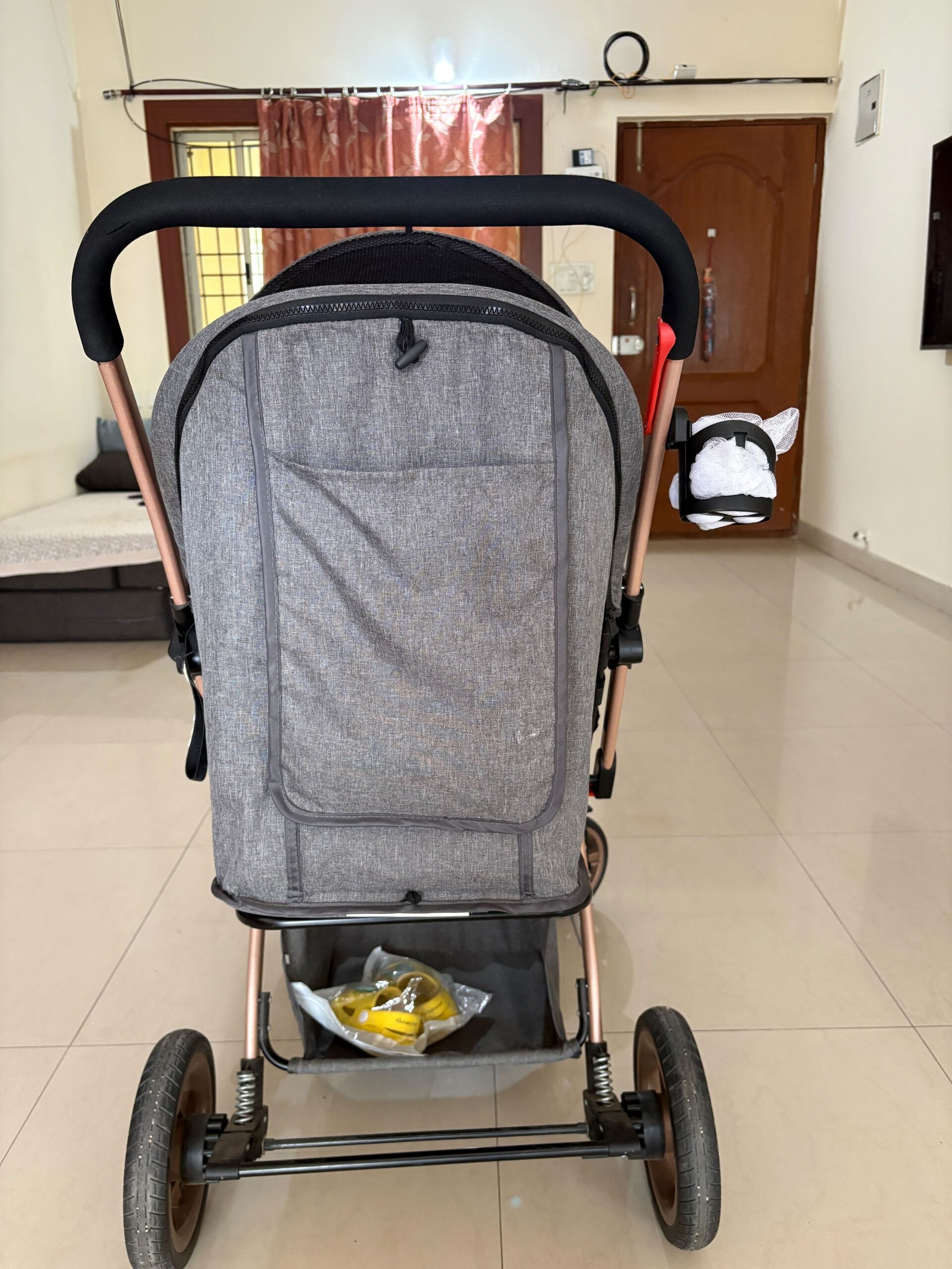 Stroller with a reversible handle and larger rubber wheels. FREE Mosquito Net & Bottle Holder & underneath is a Storage Basket. Steel ball bearings to make the ride jerk free with double shock absorption spring system.